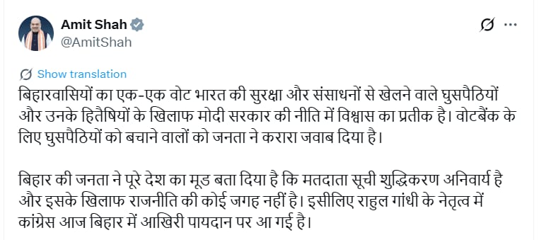 गृह मंत्री ने आगे कहा कि बिहार के लोगों ने साफ बता दिया है कि मतदाता सूची का शुद्धिकरण आवश्यक है और इसके खिलाफ राजनीति करने वालों के लिए अब कोई स्थान नहीं बचा है। शाह ने इसे देशभर की जनता की सोच का प्रतिबिंब बताया, जो पारदर्शी और सुरक्षित चुनाव प्रणाली को मजबूत करने की दिशा में है। उन्होंने कहा कि सुरक्षा और पहचान के मुद्दे अब चुनावी विमर्श के केंद्र में हैं, और बिहार के मतदाताओं ने इस दिशा को मजबूती से आगे बढ़ाया है।