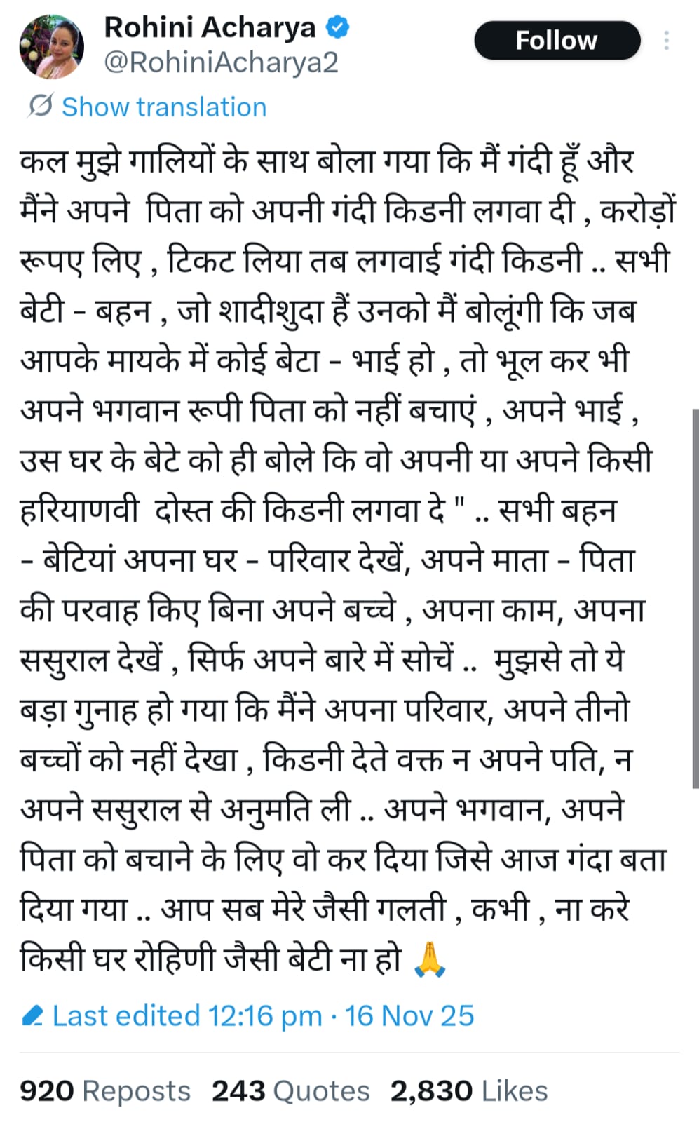 तीसरे ट्वीट में रोहिणी ने आरोप लगाया कि उन्हें गालियां देकर उनके पिता को दी गई किडनी पर भी सवाल उठाए गए। उन्होंने लिखा कि उन पर आरोप लगाया गया कि उन्होंने किडनी “टिकट और पैसे के बदले” दी। रोहिणी ने भावुक होकर कहा कि उन्होंने पिता को बचाने के लिए अपने पति और बच्चों से अनुमति लिए बिना किडनी दी, लेकिन परिवार ने उसी त्याग को “गंदा” कहा। अपने संदेश में उन्होंने बेटियों और बहनों से आग्रह किया कि वे अपने परिवार से ऊपर अपने जीवन और भविष्य को प्राथमिकता दें।