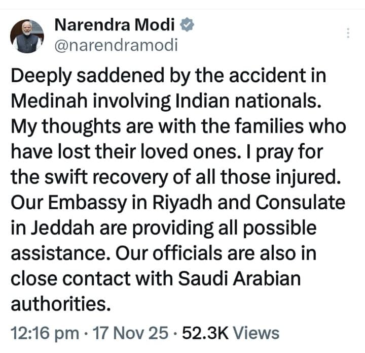हादसे की जानकारी सामने आने के बाद प्रधानमंत्री नरेंद्र मोदी ने गहरा दुख व्यक्त किया और पीड़ित परिवारों के प्रति संवेदना प्रकट की। उन्होंने कहा, “Deeply saddened by the accident in Medinah involving Indian nationals. My thoughts are with the families who have lost their loved ones. I pray for the swift recovery of all those injured.” प्रधानमंत्री ने यह भी बताया कि रियाद स्थित भारतीय दूतावास और जेद्दाह के भारतीय कॉन्सुलेट को सभी संभव सहायता प्रदान करने के निर्देश दे दिए गए हैं। उन्होंने कहा कि भारतीय अधिकारी सऊदी अरब के प्रशासन के साथ लगातार संपर्क में हैं और हर आवश्यक औपचारिकता तेजी से पूरी की जा रही है। केंद्र सरकार ने आश्वासन दिया है कि पीड़ितों की हर संभव मदद की जाएगी।