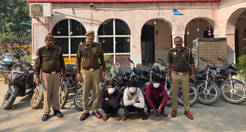 Greater Noida News (17/11/2025): ग्रेटर नोएडा में वाहन चोरी की बढ़ती घटनाओं पर अंकुश लगाते हुए बिसरख थाना पुलिस ने एक सक्रिय गिरोह का पर्दाफाश किया है। गोपनीय सूचना के आधार पर पुलिस टीम ने सुपरकास्ट के पास कच्ची सड़क से तीन आरोपियों को गिरफ्तार किया। गिरफ्तार किए गए आरोपियों से चोरी की गई 9 मोटरसाइकिलें, 2 स्कूटी और 2 अवैध चाकू बरामद किए गए हैं।
