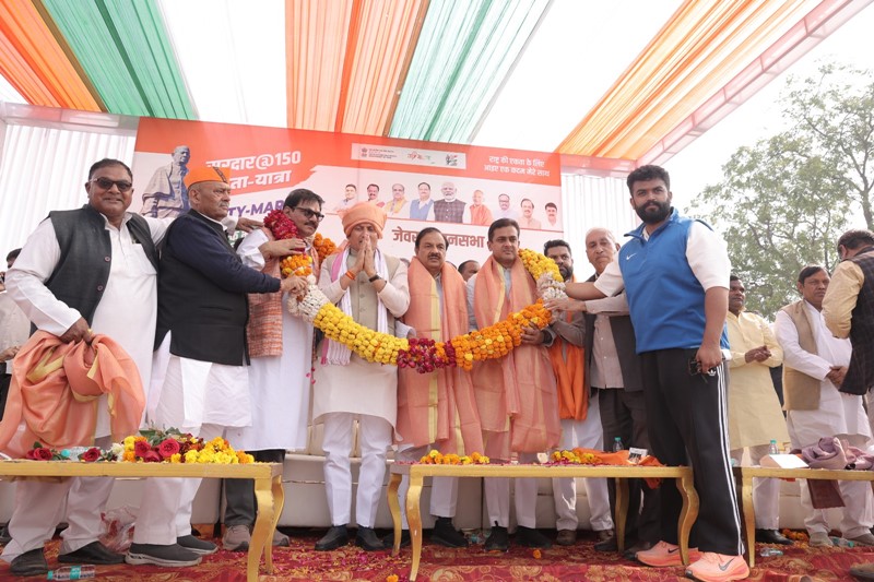 Greater Noida News (20/11/2025): भारत के लौह पुरुष तथा देश की एकता और अखंडता के शिल्पकार सरदार वल्लभभाई पटेल (Sardar Vallabhbhai Patel) की 150वीं जयंती के अवसर पर एक भारत, आत्मनिर्भर भारत अभियान के तहत आज 20 नवम्बर को जेवर विधानसभा में एक विशाल पदयात्रा एवं जनसभा का आयोजन किया गया।