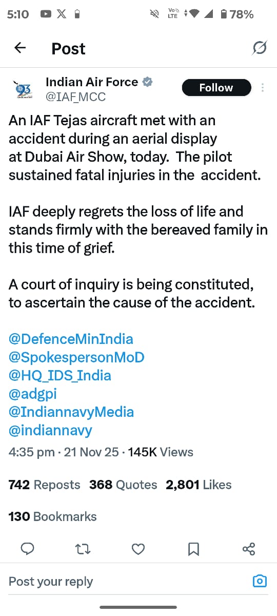 भारतीय वायुसेना ने अपने आधिकारिक बयान में पायलट के निधन पर गहरा शोक व्यक्त किया है और कहा है कि वह इस कठिन समय में शहीद पायलट के परिजनों के साथ मजबूती से खड़ी है। वायुसेना ने कहा कि यह हादसा न केवल संगठन बल्कि पूरे देश के लिए एक दुखद क्षण है, क्योंकि तेजस लंबे समय से भारत की स्वदेशी रक्षा क्षमताओं का प्रतीक रहा है।