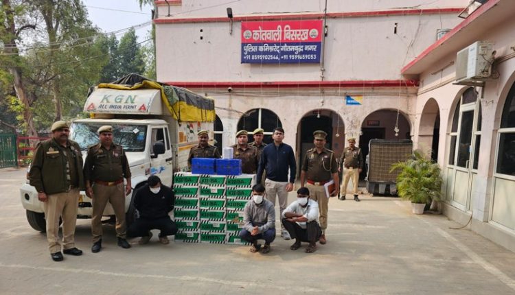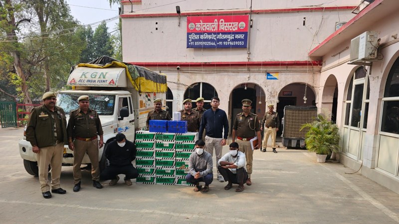 Greater Noida News (23/11/2025): ग्रेटर नोएडा के थाना बिसरख पुलिस और आबकारी विभाग की संयुक्त टीम ने अवैध रूप से शराब (Illegal Alcohol) का कारोबार करने वाले गिरोह का खुलासा करते हुए तीन आरोपियों को गिरफ्तार किया है। टीम ने आरोपियों के कब्जे से 21 पेटी बीयर (कुल 504 कैन) तथा वारदात में प्रयुक्त एक महिंद्रा पिक-अप वाहन बरामद किया है।