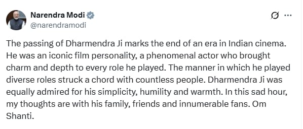 प्रधानमंत्री नरेंद्र मोदी ने अभिनेता धर्मेंद्र के निधन पर गहरा शोक व्यक्त करते हुए कहा कि धर्मेंद्र जी का जाना भारतीय सिनेमा के एक पूरे युग का अंत है। उन्होंने उन्हें एक आइकॉनिक फिल्म पर्सनैलिटी बताया, जिनकी अदाकारी में गजब का आकर्षण, गहराई और बहुमुखी प्रतिभा झलकती थी। पीएम मोदी के अनुसार, धर्मेंद्र ने अपने विविध किरदारों से करोड़ों दिलों को छुआ और अपनी सरलता, विनम्रता तथा गर्मजोशी से लोगों का दिल जीता। प्रधानमंत्री ने कहा कि इस बेहद दुखद घड़ी में उनके विचार और संवेदनाएं धर्मेंद्र के परिवार, मित्रों और देश-दुनिया में फैले अनगिनत प्रशंसकों के साथ हैं। उन्होंने दिवंगत आत्मा की शांति के लिए प्रार्थना की।