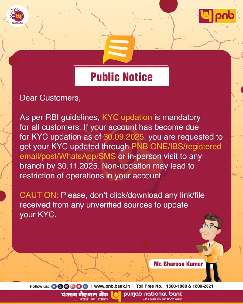 PNB ने ग्राहकों को KYC स्टेटस चेक करने का आसान तरीका भी बताया है। ग्राहक PNB ऑनलाइन बैंकिंग में लॉगिन करके पर्सनल सेटिंग्स में जाकर अपना स्टेटस देख सकते हैं। वहीं, PNB ONE ऐप में लॉगिन करने पर भी KYC अपडेट की आवश्यकता होने पर ऐप स्क्रीन पर नोटिफिकेशन दिखाई देगा। बैंक ने यह भी स्पष्ट किया कि KYC यानी Know Your Customer एक अनिवार्य प्रक्रिया है, जो ग्राहक की पहचान की पुष्टि करने और धोखाधड़ी तथा मनी लॉन्ड्रिंग रोकने के लिए जरूरी है।