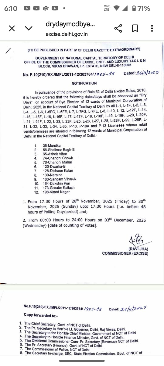 New Delhi News (27 November 2025): दिल्ली सरकार ने एमसीडी उपचुनाव को देखते हुए 28 से 30 नवंबर तक राजधानी के कई इलाकों में ड्राई डे घोषित कर दिया है। आदेश के तहत ग्रेटर कैलाश, मुंडका, शालीमार बाग, चांदनी चौक, द्वारका, नारायणा समेत कुल 12 क्षेत्रों में तीन दिनों तक सभी शराब की दुकानें पूरी तरह बंद रहेंगी। अधिकारियों के अनुसार चुनावी आचार संहिता लागू होते ही शराब की बिक्री पर रोक जरूरी है, ताकि मतदान प्रक्रिया शांतिपूर्ण और पारदर्शी तरीके से पूरी हो सके।