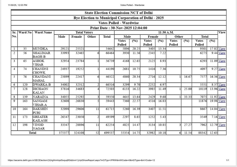 New Delhi News (30 November 2025): दिल्ली नगर निगम के 12 वार्डों में हो रहे उपचुनाव में सुबह 11:30 बजे तक कुल 12.63% मतदान दर्ज किया गया। राज्य चुनाव आयोग द्वारा जारी आंकड़ों के अनुसार कुल 6,99,537 पंजीकृत मतदाताओं में से 88,342 ने अपने मताधिकार का प्रयोग किया। वार्डवार डेटा में कई जगह मतदान की गति बेहद धीमी दिखाई दी, जबकि कुछ वार्डों में पुरुष मतदाताओं की उपस्थिति महिलाओं की तुलना में अधिक रही। शुरुआती 4 घंटों में शहर के अधिकतर बूथों पर सामान्य भीड़ देखी गई और कई क्षेत्रों में अभी मतदान गति पकड़ना बाकी है।