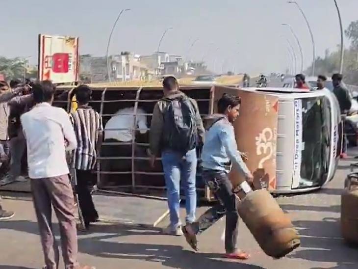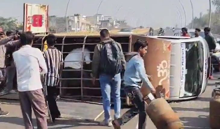NOIDA News (01/12/2025): नोएडा के भंगेल एलिवेटेड रोड पर आज दोपहर एक बड़ा हादसा होने से टल गया। एलपीजी सिलेंडरों (LPG Cylinder) से भरा एक टैंपो तेज रफ्तार में आते हुए अचानक अनियंत्रित हो गया और सड़क पर पलट गया। हादसे के समय टैंपो में दर्जनों सिलेंडर लदे हुए थे, लेकिन सौभाग्य से उनमें न तो लीकेज हुआ और न ही कोई विस्फोट, वरना यह दुर्घटना भयानक रूप ले सकती थी।