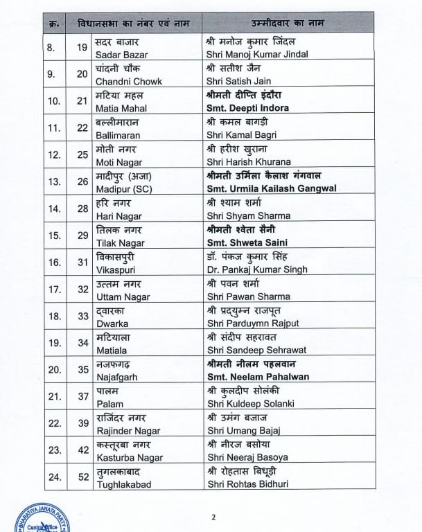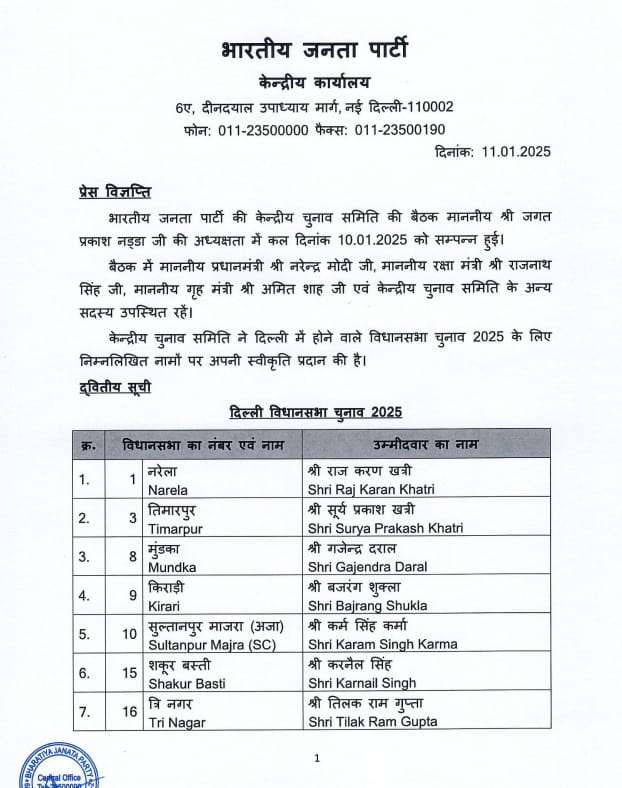 Delhi Election 2025: बीजेपी की दूसरी लिस्ट जारी, 29 प्रत्याशियों के नामों की घोषणा