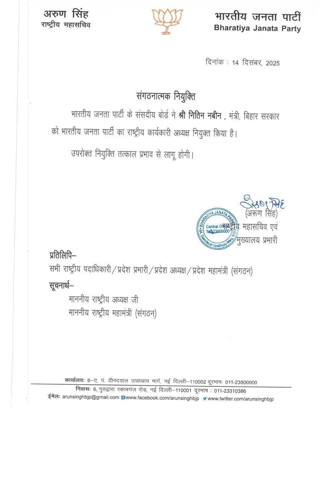 National News (14 December 2025): भारतीय जनता पार्टी (BJP) ने संगठन में बड़ा बदलाव करते हुए बिहार सरकार में मंत्री नितिन नबीन को पार्टी का नया राष्ट्रीय कार्यकारी अध्यक्ष नियुक्त किया है। यह घोषणा रविवार को बीजेपी के राष्ट्रीय महासचिव अरुण सिंह द्वारा जारी एक आधिकारिक प्रेस रिलीज के माध्यम से की गई। नितिन नबीन अब पार्टी के मौजूदा राष्ट्रीय अध्यक्ष जेपी नड्डा की जगह यह जिम्मेदारी संभालेंगे।