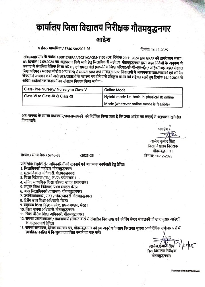 Gautam Buddha Nagar News (15/12/2025): जनपद गौतमबुद्ध नगर में वायु प्रदूषण के बढ़ते स्तर और छात्रों के स्वास्थ्य पर पड़ने वाले प्रतिकूल प्रभाव को देखते हुए जिला विद्यालय निरीक्षक (DIOS) ने स्कूलों और कोचिंग संस्थानों के संचालन को लेकर महत्वपूर्ण आदेश जारी किया है। यह आदेश वायु गुणवत्ता प्रबंधन आयोग (CAQM) की GRAP (ग्रेडेड रिस्पांस एक्शन प्लान) की दिशा-निर्देश संख्या-83 के अनुपालन में जिलाधिकारी द्वारा दिए गए निर्देशों के क्रम में जारी किया गया है।