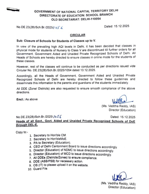 शिक्षा निदेशक वेदिता रेड्डी के हस्ताक्षर से जारी इस आदेश में सभी ज़ोन और ज़िलों के डिप्टी डायरेक्टर ऑफ एजुकेशन (DDE) को निर्देश दिया गया है कि वे आदेश के सुचारू अनुपालन को सुनिश्चित करें। दिल्ली सरकार ने साफ किया है कि बच्चों के स्वास्थ्य को सर्वोच्च प्राथमिकता देते हुए यह कदम उठाया गया है और हालात सामान्य होने पर आगे की सूचना जारी की जाएगी।
