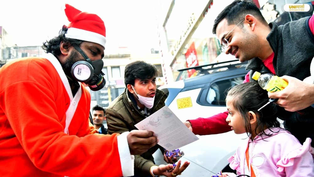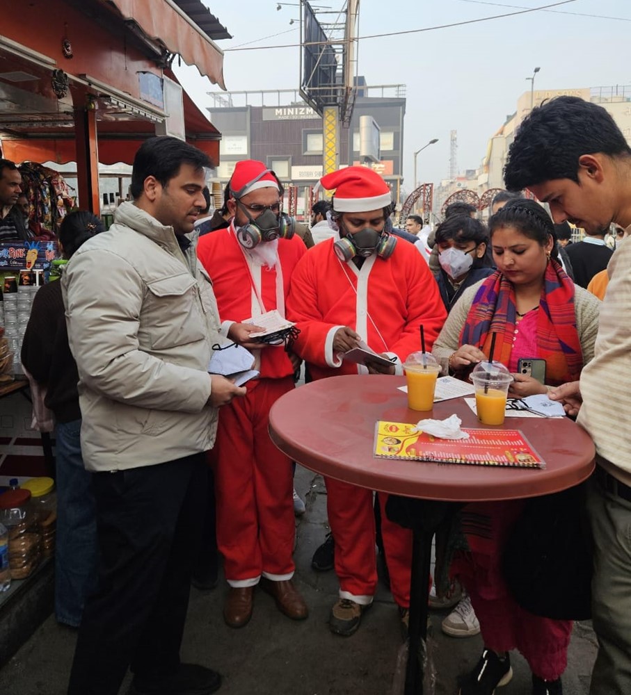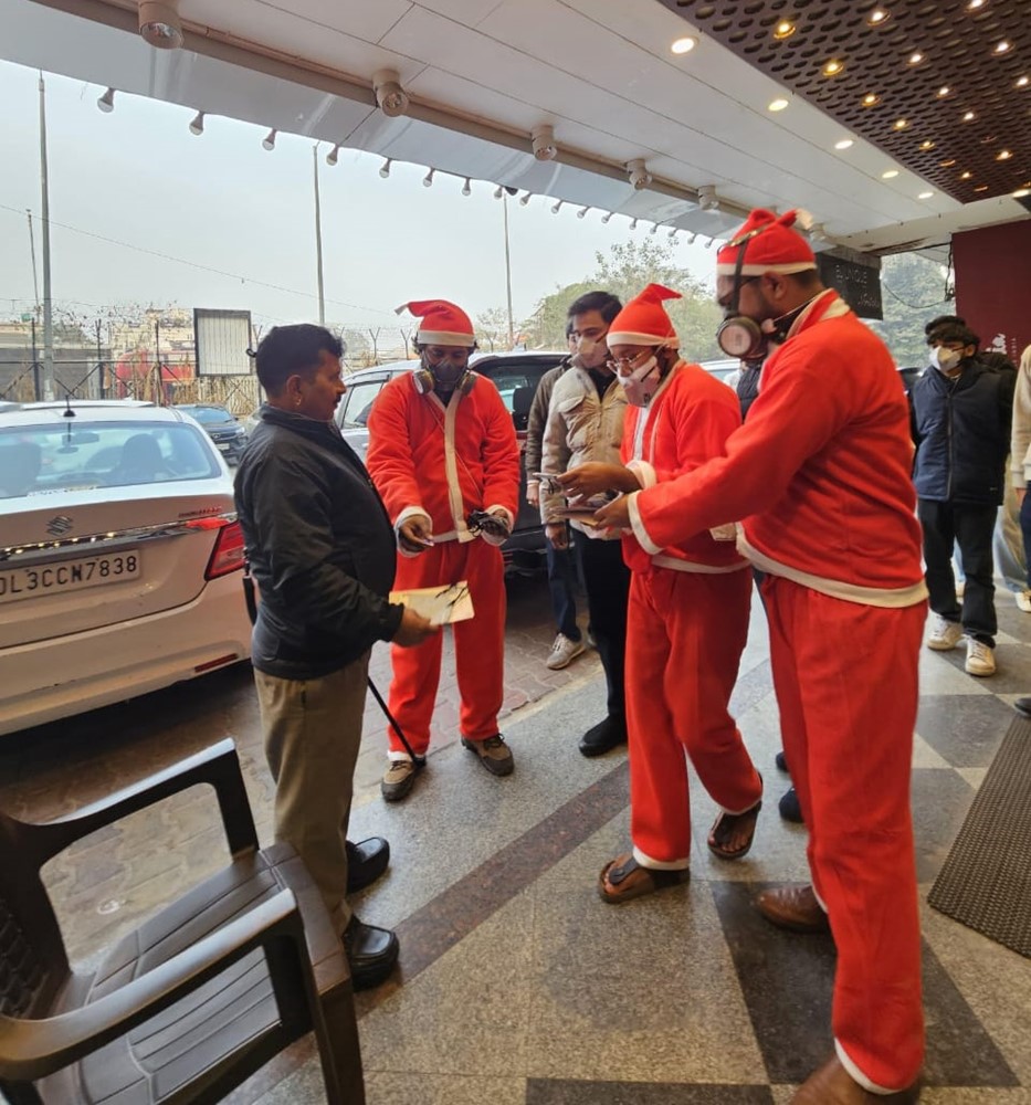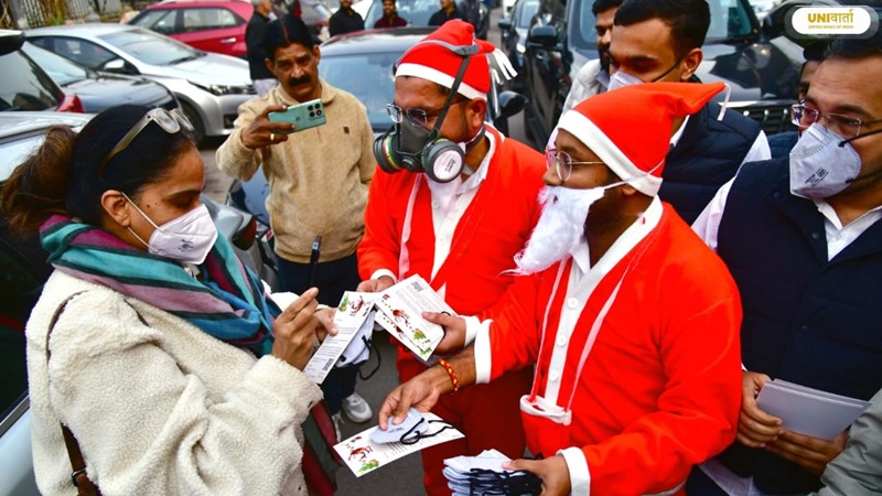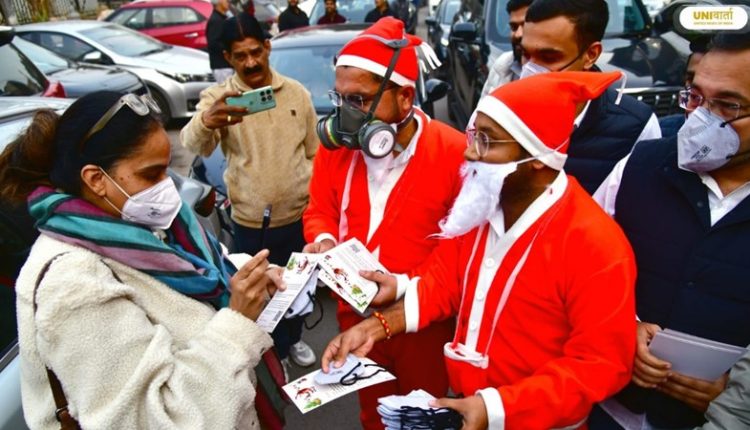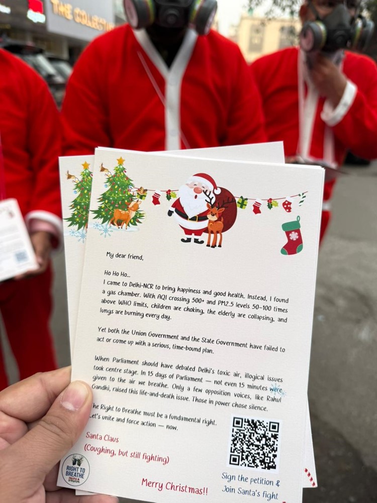 दिल्ली की सड़कों पर अनोखा प्रदर्शन: गैस मास्क पहनकर सड़कों पर उतरे ‘सांता क्लॉज़’
