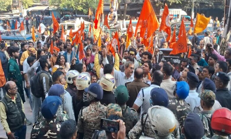 New Delhi News (23 December 2025): नई दिल्ली में मंगलवार को बांग्लादेश में हिंदुओं पर कथित उत्पीड़न और एक हिंदू युवक की हत्या के विरोध में विश्व हिंदू परिषद (VHP) और बजरंग दल की ओर से जोरदार प्रदर्शन किया गया। यह विरोध प्रदर्शन देशभर के जिला मुख्यालयों पर आयोजित किया गया, वहीं राजधानी दिल्ली में चाणक्यपुरी स्थित बांग्लादेश उच्चायोग के बाहर प्रदर्शन को लेकर माहौल तनावपूर्ण बना रहा। प्रदर्शनकारियों ने बांग्लादेश में अल्पसंख्यकों पर हो रहे अत्याचारों के खिलाफ नारेबाजी की।