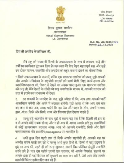 अपने पत्र में वीके सक्सेना ने यह भी आरोप लगाया कि चुनाव हारने के बाद केजरीवाल ने उनका मोबाइल नंबर ब्लॉक कर दिया। उन्होंने लिखा कि दीवाली पर शुभकामनाएं देने के लिए जब उन्होंने कॉल किया, तब उन्हें पता चला कि उनका नंबर ब्लॉक किया गया है। इसके अलावा 15 पन्नों के पत्र में एलजी ने आरोप लगाया कि AAP नेतृत्व राजनीतिक लाभ के लिए 10 महीने पुरानी सरकार के कामकाज में अनावश्यक बाधाएं डाल रहा है, जबकि मौजूदा सरकार पिछली गलतियों को सुधारने की कोशिश कर रही है।