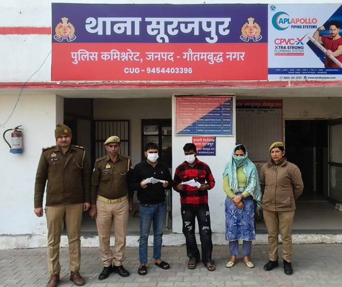 पुलिस के अनुसार, थाना सूरजपुर में दर्ज मुकदमा में फरार चल रहा गैंग लीडर बिट्टू उर्फ प्रवेश कसाना (25 वर्ष) और उसकी पत्नी सपना (26 वर्ष) को 25 दिसंबर को 130 मीटर रोड से गिरफ्तार किया गया। बिट्टू उर्फ प्रवेश कसाना के कब्जे से एक अवैध तमंचा व एक जिंदा कारतूस बरामद किया गया, जिसके संबंध में थाना सूरजपुर पर आर्म्स एक्ट के तहत अलग मुकदमा दर्ज किया गया है।