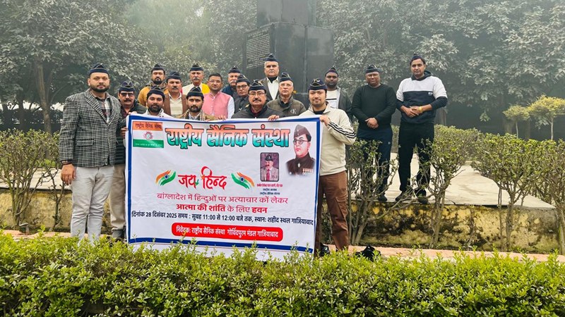 Ghaziabad News (28/12/2025): बांग्लादेश में हिंदू समुदाय पर हो रहे कथित अत्याचारों के विरोध तथा पीड़ितों की आत्मा की शांति और न्याय की कामना को लेकर रविवार को गाजियाबाद के शहीद स्मारक पार्क स्थित मनन धाम मंदिर के सामने राष्ट्रीय सैनिक संस्था द्वारा हवन एवं श्रद्धांजलि कार्यक्रम का आयोजन किया गया। यह कार्यक्रम संस्था की गोविंदपुरम और रजापुर इकाइयों के संयुक्त तत्वावधान में संपन्न हुआ।