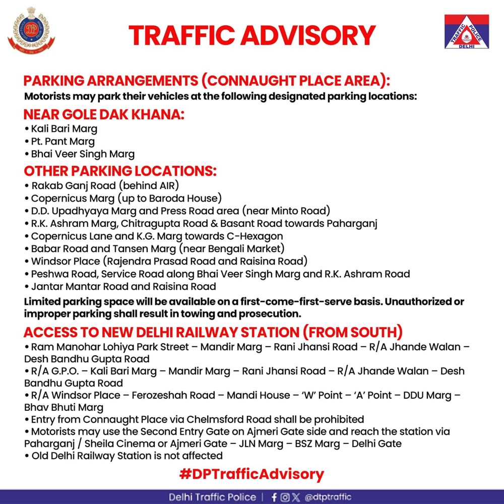 ट्रैफिक पुलिस के अनुसार, कनॉट प्लेस की ओर जाने वाले वाहनों को कई तय प्वाइंट्स से आगे नहीं जाने दिया जाएगा। मंडी हाउस, बंगाली मार्केट, रंजीत सिंह फ्लाईओवर, मिंटो रोड–दीनदयाल उपाध्याय मार्ग क्रॉसिंग, चेम्सफोर्ड रोड, आरके आश्रम मार्ग, गोल मार्केट, जीपीओ, पटेल चौक, कस्तूरबा गांधी रोड, जय सिंह रोड और विंडसर प्लेस जैसे इलाकों से आगे वाहनों की आवाजाही पर रोक रहेगी। इससे इलाके में भीड़ और जाम की स्थिति से बचा जा सकेगा।