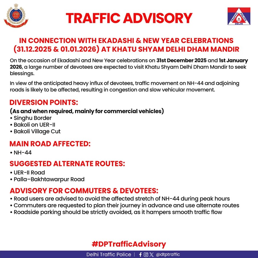 New Delhi News (31 December 2025): दिल्ली के खाटू श्याम मंदिर में एकादशी और नववर्ष (31 दिसंबर 2025 और 1 जनवरी 2026) के अवसर पर बड़ी संख्या में श्रद्धालुओं के पहुंचने की संभावना को देखते हुए दिल्ली ट्रैफिक पुलिस ने विशेष ट्रैफिक एडवाइजरी जारी की है। अधिकारियों के अनुसार, श्रद्धालुओं की भारी आवाजाही के कारण राष्ट्रीय राजमार्ग-44 (NH-44) और उससे जुड़े मार्गों पर यातायात धीमा रहने के साथ-साथ जाम की स्थिति बन सकती है।