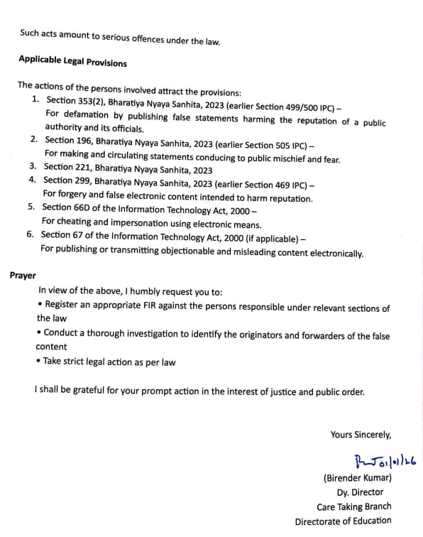 मामले की गंभीरता को देखते हुए शिक्षा निदेशालय ने सिविल लाइंस थाने में औपचारिक शिकायत दर्ज कराई है और संबंधित धाराओं के तहत एफआईआर दर्ज कर सख्त कानूनी कार्रवाई की मांग की है। शिकायत में भारतीय न्याय संहिता, 2023 और सूचना प्रौद्योगिकी अधिनियम, 2000 की विभिन्न धाराओं का उल्लेख करते हुए दोषियों की पहचान, गहन जांच और कड़ी कार्रवाई की अपील की गई है। शिक्षा विभाग ने दोहराया है कि छात्रों की सुरक्षा उसकी सर्वोच्च प्राथमिकता है और झूठी खबर फैलाने वालों के खिलाफ कानून के तहत कठोर कदम उठाए जाएंगे।।