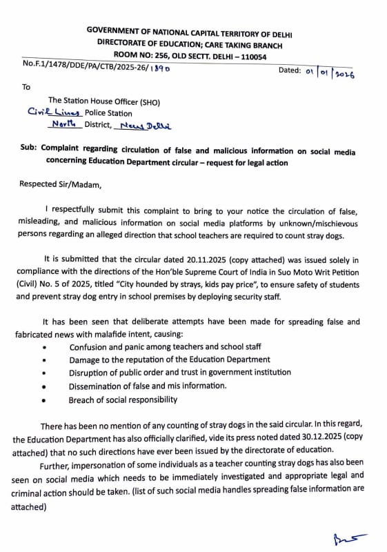 New Delhi News (02 January 2026): दिल्ली के सरकारी स्कूलों के शिक्षकों से आवारा कुत्तों की गिनती कराए जाने के कथित निर्देश को लेकर फैल रही खबरों पर शिक्षा निदेशालय (Directorate of Education), दिल्ली सरकार ने कड़ा रुख अपनाया है। निदेशालय ने स्पष्ट शब्दों में कहा है कि सोशल और डिजिटल मीडिया पर प्रसारित किए जा रहे ऐसे दावे पूरी तरह झूठे, भ्रामक और मनगढ़ंत हैं। शिक्षा निदेशक ने मीडिया को संबोधित करते हुए कहा कि विभाग की ओर से ऐसा कोई आदेश, परिपत्र, निर्देश या नीति निर्णय कभी जारी नहीं किया गया है और इन दावों का वास्तविकता से कोई संबंध नहीं है।