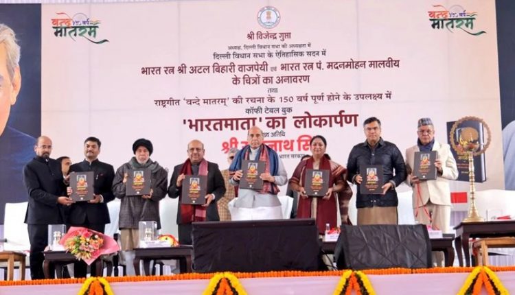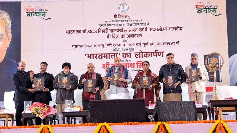 New Delhi News (03 January 2026): दिल्ली विधानसभा में शनिवार को एक विशेष समारोह के दौरान ‘भारत माता’ शीर्षक से प्रकाशित कॉफी टेबल बुक का भव्य अनावरण किया गया। इस अवसर पर केंद्रीय रक्षा मंत्री राजनाथ सिंह, दिल्ली के मुख्यमंत्री रेखा गुप्ता, दिल्ली विधानसभा अध्यक्ष वीरेंद्र गुप्ता, उपाध्यक्ष मोहन सिंह बिष्ट और दिल्ली भाजपा अध्यक्ष वीरेंद्र सचदेवा सहित कई गणमान्य व्यक्ति उपस्थित रहे। कार्यक्रम में भारतीय राष्ट्रबोध और सांस्कृतिक विरासत पर केंद्रित इस विशिष्ट ग्रंथ को लेकर उत्साह का माहौल रहा।
