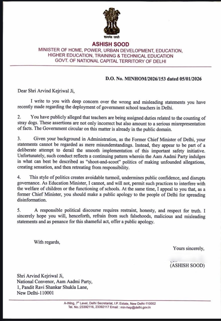 शिक्षा मंत्री ने साफ शब्दों में कहा कि शिक्षकों से आवारा कुत्तों की गिनती कराने का आरोप पूरी तरह झूठा है और इस संबंध में सरकार का आधिकारिक सर्कुलर (Circular) पहले से सार्वजनिक डोमेन में मौजूद है। इसके बावजूद ऐसे आरोप लगाना दर्शाता है कि यह महज गलतफहमी नहीं, बल्कि जानबूझकर फैलाया गया भ्रम है। आशीष सूद ने पत्र में यह भी लिखा कि प्रशासनिक अनुभव रखने वाले नेता से इस तरह की गैर-जिम्मेदार बयानबाजी की उम्मीद नहीं की जा सकती।