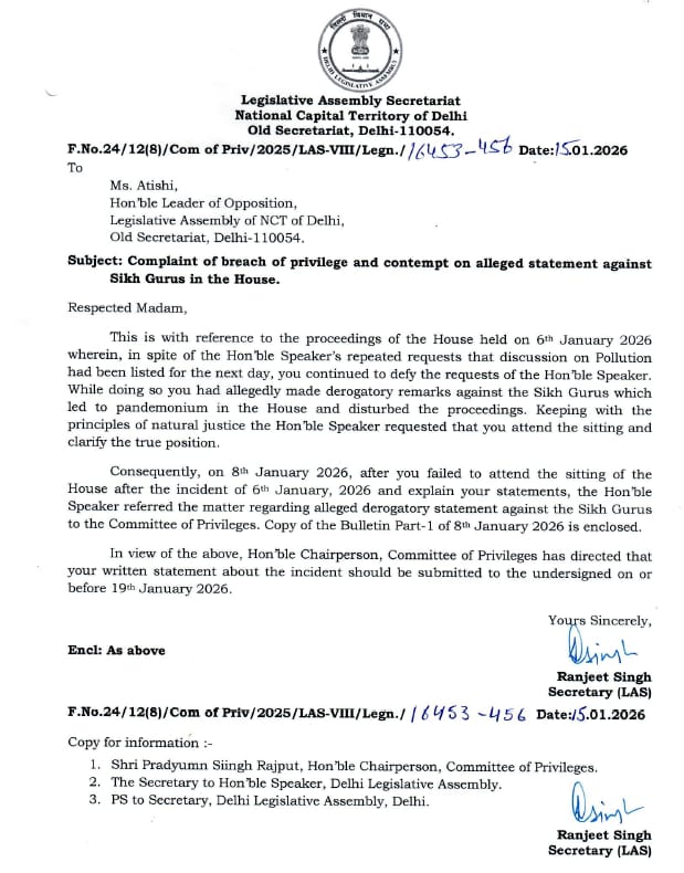 New Delhi News (15 January 2026): दिल्ली विधानसभा सचिवालय ने नेता प्रतिपक्ष आतिशी को सिख गुरुओं के खिलाफ कथित आपत्तिजनक बयान देने के मामले में नोटिस जारी किया है। यह नोटिस 15 जनवरी 2026 को जारी हुआ, जिसमें 6 जनवरी को सदन की कार्यवाही के दौरान विशेषाधिकार हनन और अवमानना के आरोपों का जिक्र किया गया है।विधानसभा सचिवालय के अनुसार, इस मामले ने सदन की कार्यवाही को प्रभावित किया और व्यापक विवाद को जन्म दिया।
