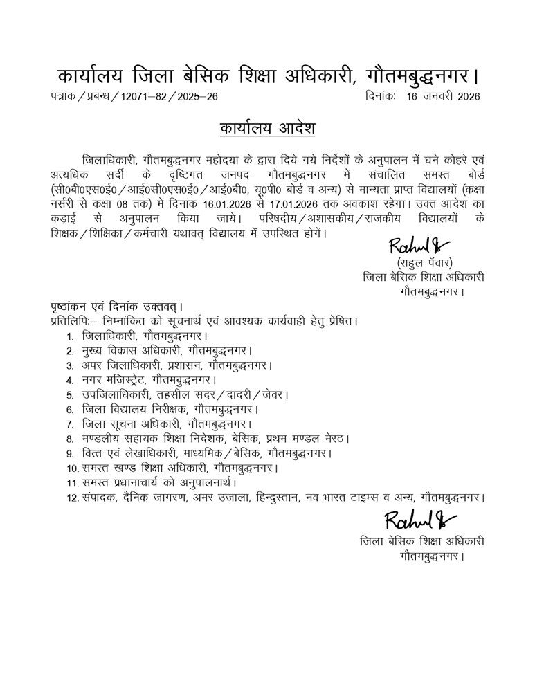 GREATER NOIDA News (16/01/2026): घने कोहरे और लगातार बढ़ती सर्दी को देखते हुए जिला प्रशासन ने गौतमबुद्ध नगर में स्कूल जाने वाले बच्चों की सुरक्षा के मद्देनज़र बड़ा निर्णय लिया है। जिलाधिकारी के निर्देश पर जिला बेसिक शिक्षा अधिकारी कार्यालय द्वारा जनपद में संचालित सभी बोर्डों के विद्यालयों में कक्षा नर्सरी से कक्षा आठ तक के विद्यार्थियों के लिए दो दिवसीय अवकाश घोषित किया गया है।