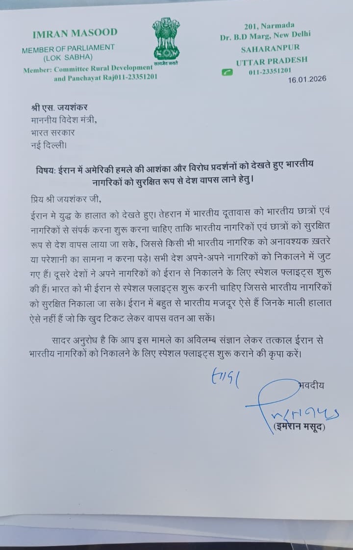 New Delhi News (16 जनवरी, 2026): ईरान में अमेरिकी हमलों और बढ़ते तनाव के बीच भारतीय नागरिकों की सुरक्षा को लेकर चिंता जताते हुए सहारनपुर से लोकसभा सांसद इमरान मसूद ने विदेश मंत्री एस. जयशंकर को पत्र लिखकर तत्काल हस्तक्षेप की मांग की है। सांसद ने आग्रह किया है कि ईरान में फंसे भारतीय नागरिकों और छात्रों को सुरक्षित रूप से देश वापस लाने के लिए विशेष व्यवस्था की जाए।