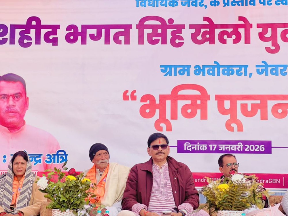 Jewar Airport News (17/01/2026): जेवर विधानसभा के ग्राम भवोकरा में लगभग 1.50 करोड़ रुपए की धनराशि से निर्मित होने वाले शहीद भगत सिंह खेलो युवा स्पोर्ट्स पार्क (Shaheed Bhagat Singh Khelo Youth Sports Park) का भूमि पूजन वैदिक मंत्रोच्चारण से संपन्न हुआ। यह स्पोर्ट्स पार्क क्षेत्र के युवाओं को खेल, स्वास्थ्य और आत्मनिर्भरता बनाने की दिशा में नई राह प्रदान करेगी।