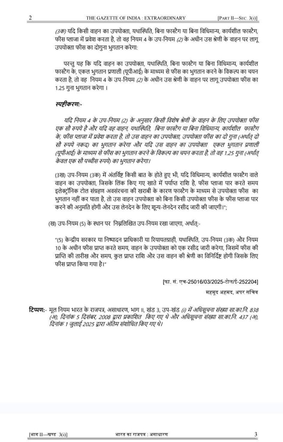 दस्तावेज़ों में साफ तौर पर उल्लेख है कि यदि किसी वाहन पर फास्टैग नहीं लगा है या तकनीकी कारणों से फास्टैग से भुगतान नहीं हो पाता, तो टोल प्लाजा पर चालक से टोल शुल्क का दुगना भुगतान लिया जा सकता है। हालांकि, यदि वाहन चालक नगद के बजाय यूपीआई या अन्य डिजिटल माध्यम से भुगतान करने का विकल्प चुनता है, तो उससे केवल निर्धारित टोल राशि का 1.25 गुना ही लिया जाना चाहिए। यह प्रावधान नियमों के तहत स्पष्ट रूप से दर्ज है।