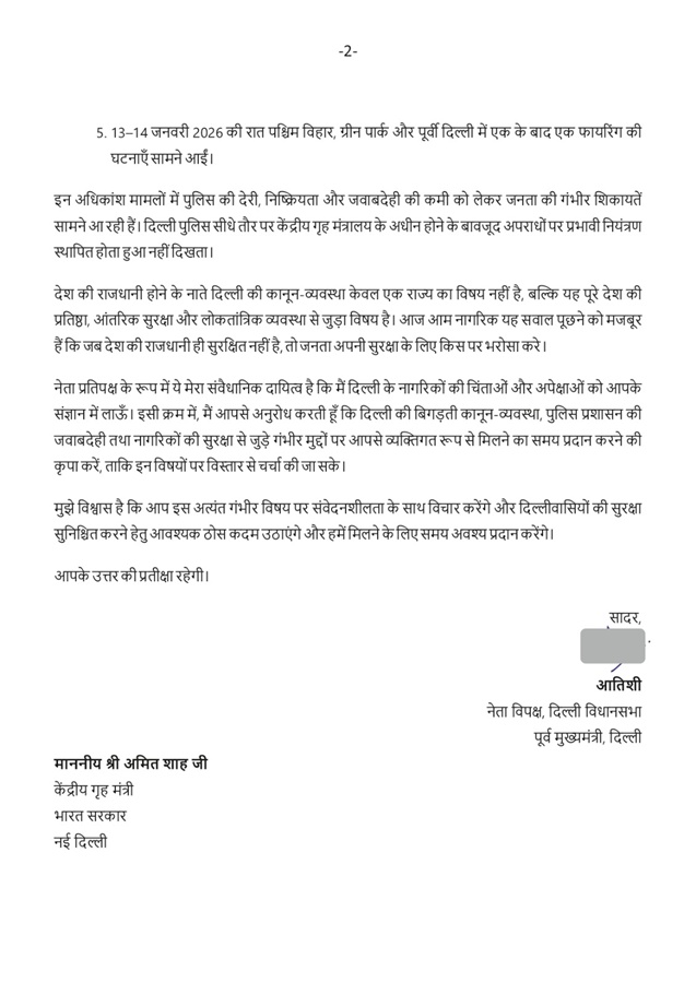 New Delhi News (19 जनवरी, 2026): दिल्ली में लगातार बिगड़ती कानून-व्यवस्था को लेकर आम आदमी पार्टी की नेता प्रतिपक्ष आतिशी ने केंद्रीय गृहमंत्री अमित शाह को एक विस्तृत पत्र लिखकर गंभीर चिंता जताई है। आतिशी ने राजधानी में बढ़ते अपराधों, सरेआम हत्याओं और सुरक्षा में हो रही चूकों का हवाला देते हुए गृहमंत्री से व्यक्तिगत रूप से मिलने का समय मांगा है, ताकि इन मुद्दों पर विस्तार से चर्चा की जा सके।
