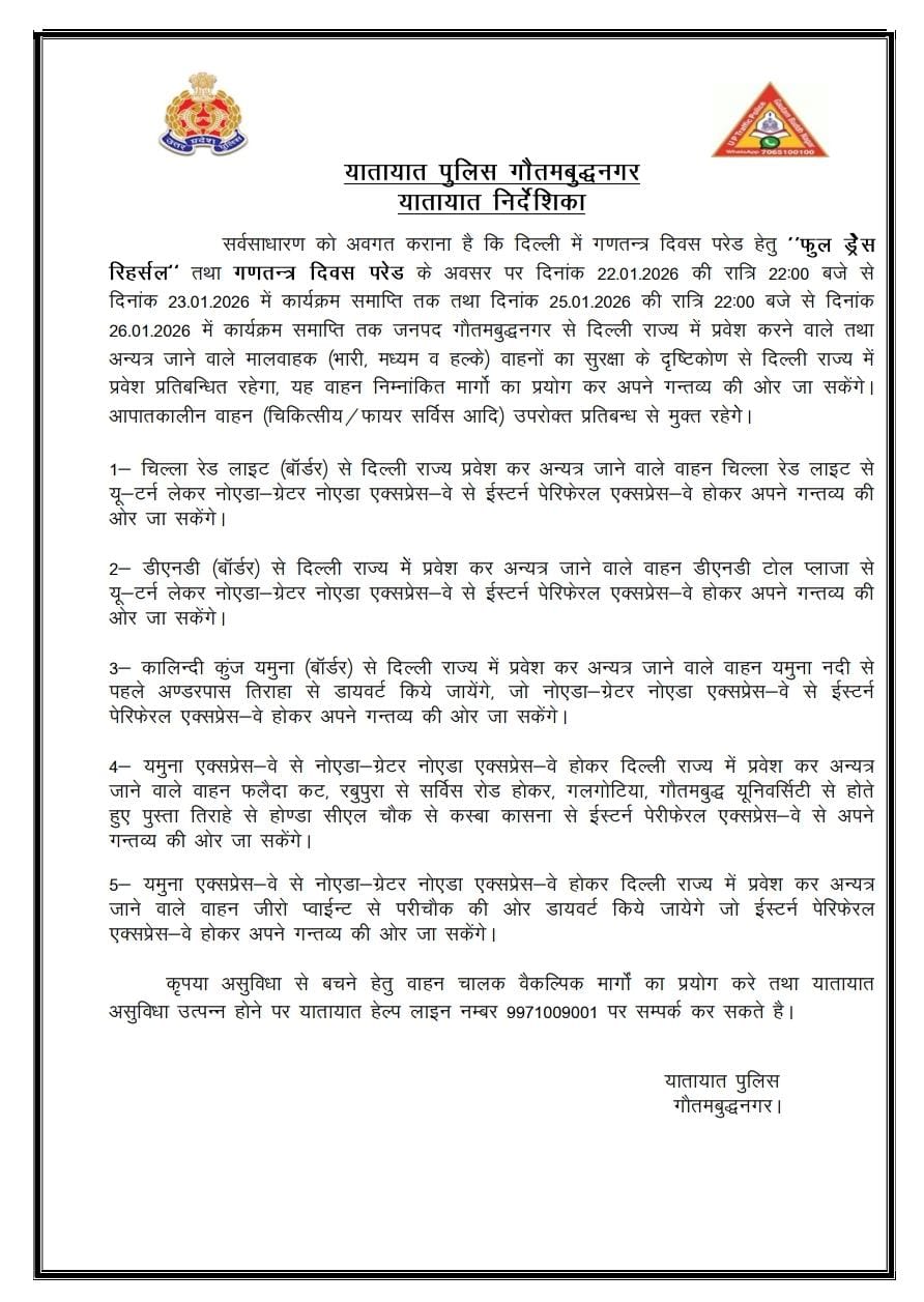 Republic Day 2026: गौतमबुद्ध नगर से दिल्ली में प्रवेश करने वाले वाहनों के लिए विशेष निर्देश