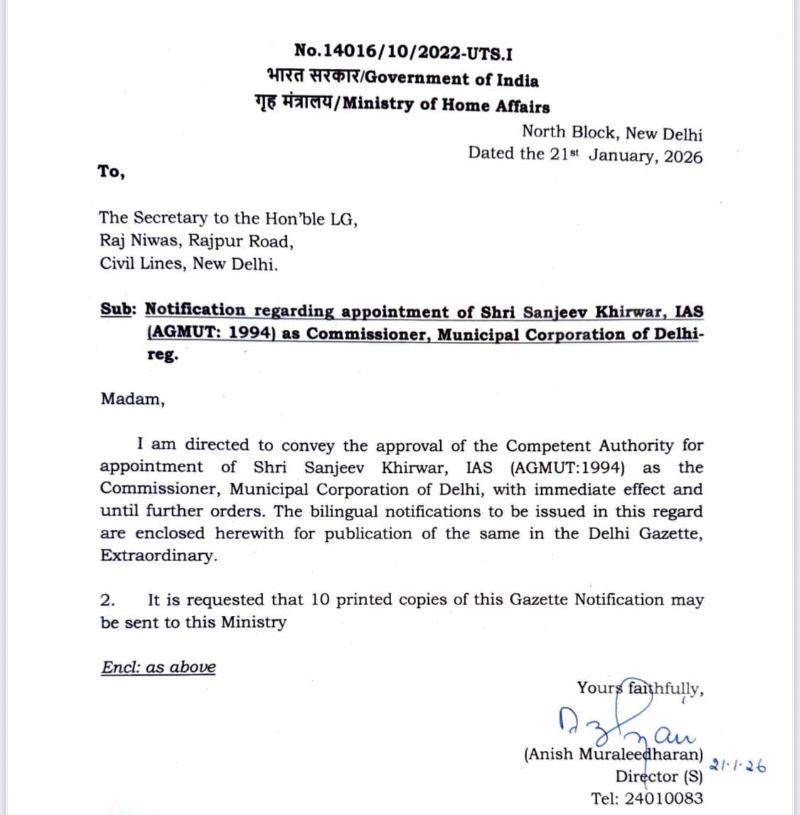 New Delhi News (21 January 2026): दिल्ली नगर निगम को नया कमिश्नर मिल गया है। गृह मंत्रालय ने 1994 बैच के आईएएस अधिकारी संजीव खिरवार को दिल्ली नगर निगम का आयुक्त नियुक्त किया है। उनकी नियुक्ति तुरंत प्रभाव से लागू हो गई है और इस संबंध में मंत्रालय ने आधिकारिक आदेश भी जारी कर दिया है।