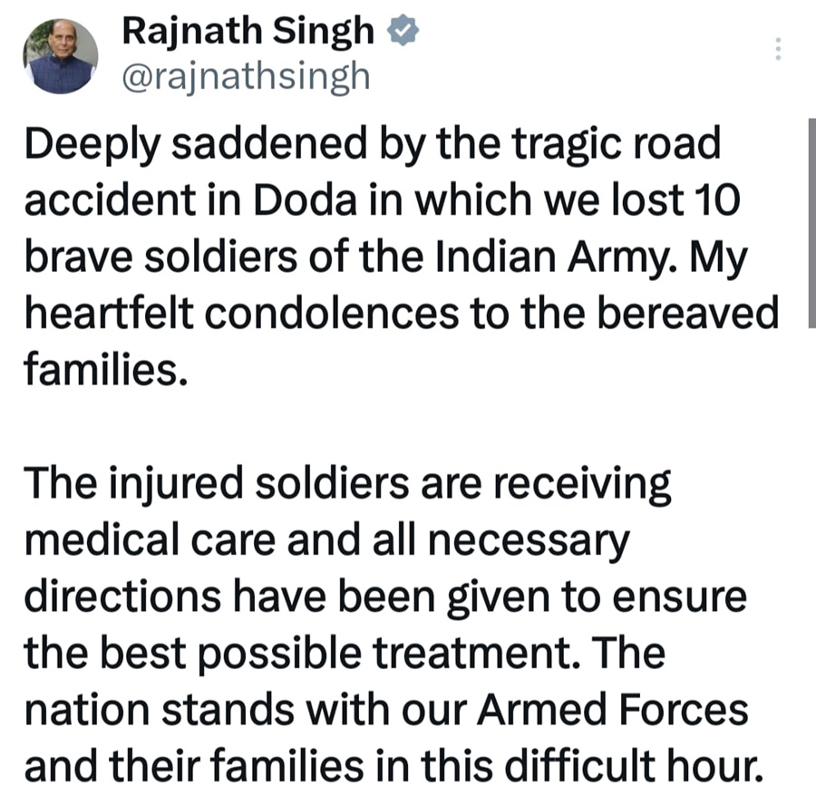 पूर्व मुख्यमंत्री महबूबा मुफ्ती ने डोडा से आई इस दुखद खबर पर गहरा शोक व्यक्त करते हुए कहा कि उनकी संवेदनाएं शोक संतप्त परिवारों के साथ हैं और वह घायलों के शीघ्र स्वस्थ होने की प्रार्थना करती हैं। वहीं केंद्रीय मंत्री डॉ. जितेंद्र सिंह ने कहा कि सेना की गाड़ी के इस हादसे के बारे में जानकर उन्हें बेहद दुख हुआ है। उन्होंने कहा कि हर मुमकिन मेडिकल मदद दी जा रही है और हमारे बहादुर जवानों के प्रति श्रद्धा प्रकट करने के लिए शब्द भी कम पड़ जाते हैं। यह हादसा एक बार फिर देश की रक्षा में तैनात जवानों के साहस और बलिदान को उजागर करता है।।