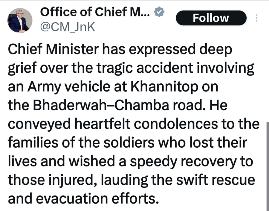 मुख्यमंत्री उमर अब्दुल्ला ने भी हादसे पर शोक जताते हुए शहीद जवानों के परिवारों के प्रति हार्दिक संवेदना व्यक्त की और घायलों के जल्द स्वस्थ होने की कामना की। उन्होंने त्वरित बचाव और निकासी प्रयासों की सराहना की। रक्षा मंत्री राजनाथ सिंह ने कहा कि दुखी परिवारों के प्रति उनकी गहरी संवेदनाएं हैं और घायल सैनिकों को लगातार मेडिकल केयर दी जा रही है। उन्होंने यह भी कहा कि सबसे अच्छा इलाज सुनिश्चित करने के लिए सभी जरूरी निर्देश दिए गए हैं।
