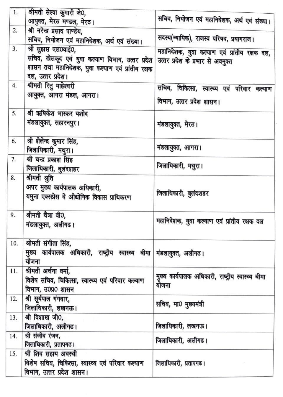 मेरठ की मंडलायुक्त सेल्वा कुमारी जी को सचिव नियोजन एवं महानिदेशक अर्थ एवं संख्या नियुक्त किया गया है। वहीं नियोजन एवं महानिदेशक अर्थ एवं संख्या के सचिव नरेंद्र प्रसाद पांडे को सदस्य न्यायिक राजस्व परिषद प्रयागराज, नियुक्त किया गया है। सुहास एलवाई, सचिव खेलकूद एवं युवा कल्याण विभाग उत्तर प्रदेश शासन तथा महानिदेशक युवा कल्याण एवं प्रांतीय रक्षक दल उत्तर प्रदेश को महानिदेशक युवा कल्याण एवं प्रांतीय रक्षक दल उत्तर प्रदेश के प्रभार से अवमुक्त किया गया है। रितु माहेश्वरी, आयुक्त आगरा मंडल, आगरा को सचिव चिकित्सा स्वास्थ्य एवं प्रमाण कल्याण विभाग उत्तर प्रदेश शासन नियुक्त किया गया है। ऋषिकेश भास्कर यशोद जो मंडल आयुक्त थे सहारनपुर के उन्हें मेरठ का मंडल आयुक्त बनाया गया है। शैलेंद्र कुमार सिंह जो जिलाधिकारी थे मथुरा के उन्हें अब मंडल आयुक्त आगरा की जिम्मेदारी सौंप गई है। चंद्र प्रकाश सिंह जिलाधिकारी बुलंदशहर को जिलाधिकारी मथुरा बनाया गया है। श्रुति अपर मुख्य कार्यपालक अधिकारी यमुना एक्सप्रेसवे औद्योगिक विकास प्राधिकरण को जिलाधिकारी बुलंदशहर के रूप में नियुक्त किया गया है। चैत्रा वी. मंडल आयुक्त अलीगढ़ को महानिदेशक युवा कल्याण एवं प्रांतीय रक्षक दल बनाया गया है। संगीता सिंह मुख्य कार्यपालक अधिकारी राष्ट्रीय स्वास्थ्य बीमा योजना को मंडल आयुक्त अलीगढ़ के रूप में नियुक्त किया गया है। अर्चना वर्मा विशेष सचिव, चिकित्सा स्वास्थ्य एवं परिवार कल्याण विभाग उत्तर प्रदेश शासन को मुख्य कार्यपालक अधिकारी राष्ट्रीय स्वास्थ्य बीमा योजना के रूप में नियुक्त किया गया है। सूर्यपाल गंगवार जिला अधिकारी लखनऊ को सचिव बनाया गया है, मुख्यमंत्री उत्तर प्रदेश का और जिलाधिकारी अलीगढ़ विशाखा जी को जिला अधिकारी लखनऊ बनाया गया है। राजीव रंजन जिला अधिकारी प्रतापगढ़ को जिलाधिकारी अलीगढ़ बनाया गया है और शिव सहाय जो विशेष सचिव चिकित्सा स्वास्थ्य एवं परिवार कल्याण विभाग उत्तर प्रदेश के थे उन्हें जिला अधिकारी प्रतापगढ़ बनाया गया है।।