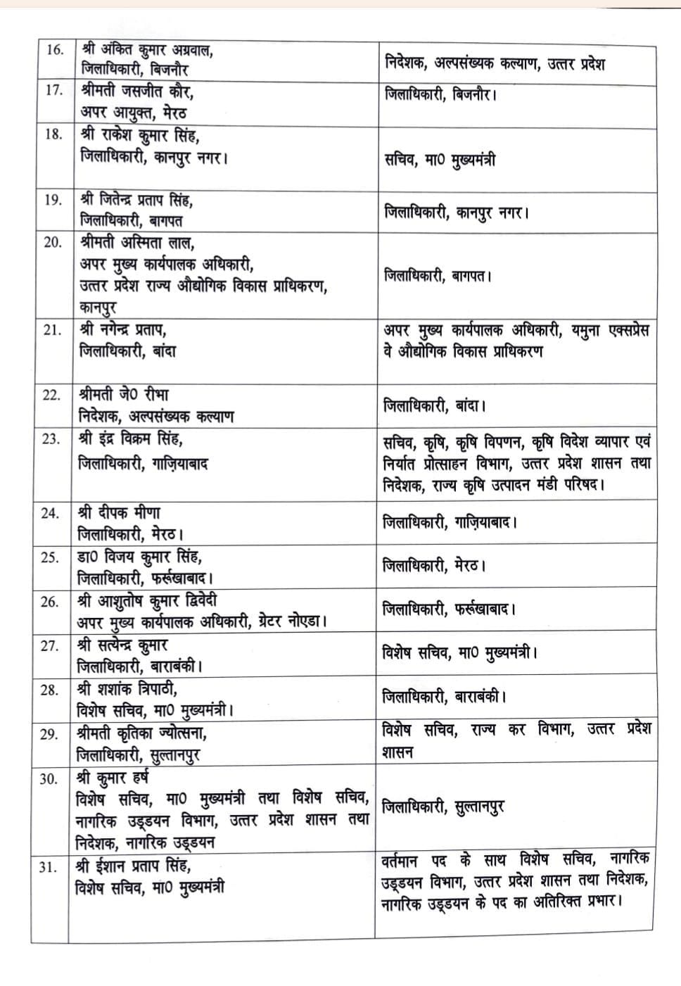 इसके अलावा अंकित कुमार अग्रवाल जो पहले जिलाधिकारी बिजनौर थे, उन्हें अब निदेशक, अल्पसंख्यक कल्याण उत्तर प्रदेश बनाया गया है। जसजीत कौर जो अपर आयुक्त मेरठ थे, उन्हें बिजनौर का जिलाधिकारी बनाया गया है। राकेश कुमार सिंह जो जिला अधिकारी थे कानपुर नगर के उन्हें सचिव बनाया गया है, मुख्यमंत्री उत्तर प्रदेश। जितेंद्र प्रताप सिंह जिलाधिकारी बागपत उन्हें नई जिम्मेदारी कानपुर नगर के जिलाधिकारी के रूप में दी गई है अस्मिता लाल अपर मुख्य कार्यपालक अधिकारी उत्तर प्रदेश राज्य औद्योगिक विकास प्राधिकरण कानपुर, उन्हें बागपत का जिलाधिकारी बनाया गया है। नागेंद्र प्रताप जिला अधिकारी बांदा थे, उन्हें अपर मुख्य कार्यपालक अधिकारी के रूप में यमुना एक्सप्रेसवे औद्योगिक विकास प्राधिकरण में तैनात किया गया है। जे. रीभा जो निदेशक थे, अल्पसंख्यक कल्याण विभाग की उन्हें बांदा का जिलाधिकारी बनाया गया है। इंद्र विक्रम सिंह जिलाधिकारी, गाजियाबाद उन्हें सचिव कृषि, कृषि विपणन, कृषि विदेश व्यापार एवं निर्यात प्रोत्साहन विभाग उत्तर प्रदेश शासन तथा निदेशक राज्य कृषि उत्पादन मंडी परिषद की जिम्मेदारी दी गई है।