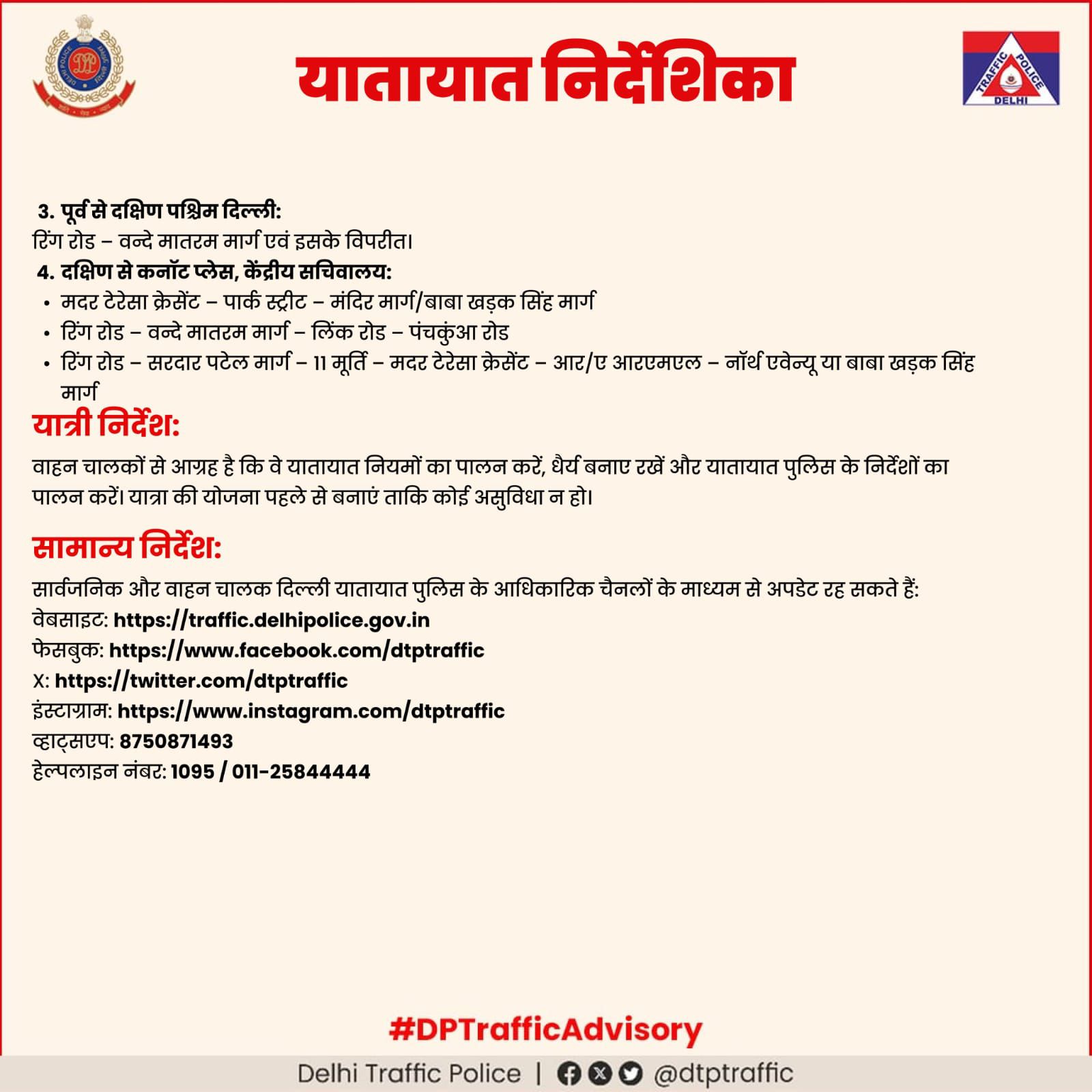 इस दौरान कर्तव्य पथ से रफी मार्ग, जनपथ क्रासिंग, मान सिंह रोड क्रासिंग और C हेक्सागन जैसे प्रमुख मार्ग प्रभावित होंगे। इन इलाकों में जाम और यातायात की रुकावट से बचने के लिए ट्रैफिक पुलिस ने वैकल्पिक मार्गों का इस्तेमाल करने की सलाह दी है।