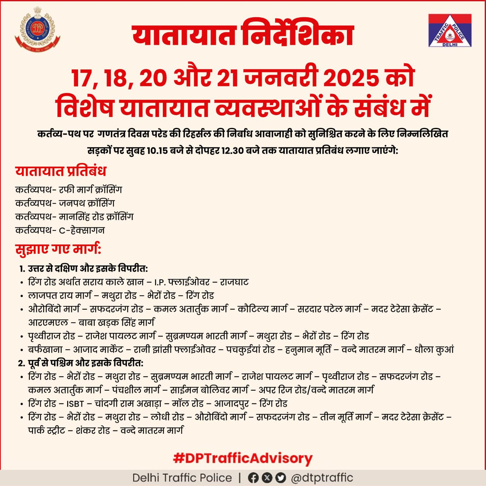 यात्री और वाहन चालकों को सुबह के समय इन मार्गों से बचने की अपील की गई है ताकि वे समय से अपनी मंजिल तक पहुंच सकें। ट्रैफिक पुलिस ने आगे कहा कि यह कदम गणतंत्र दिवस की रिहर्सल के चलते लिया गया है और 21 जनवरी से स्थिति सामान्य हो जाएगी।