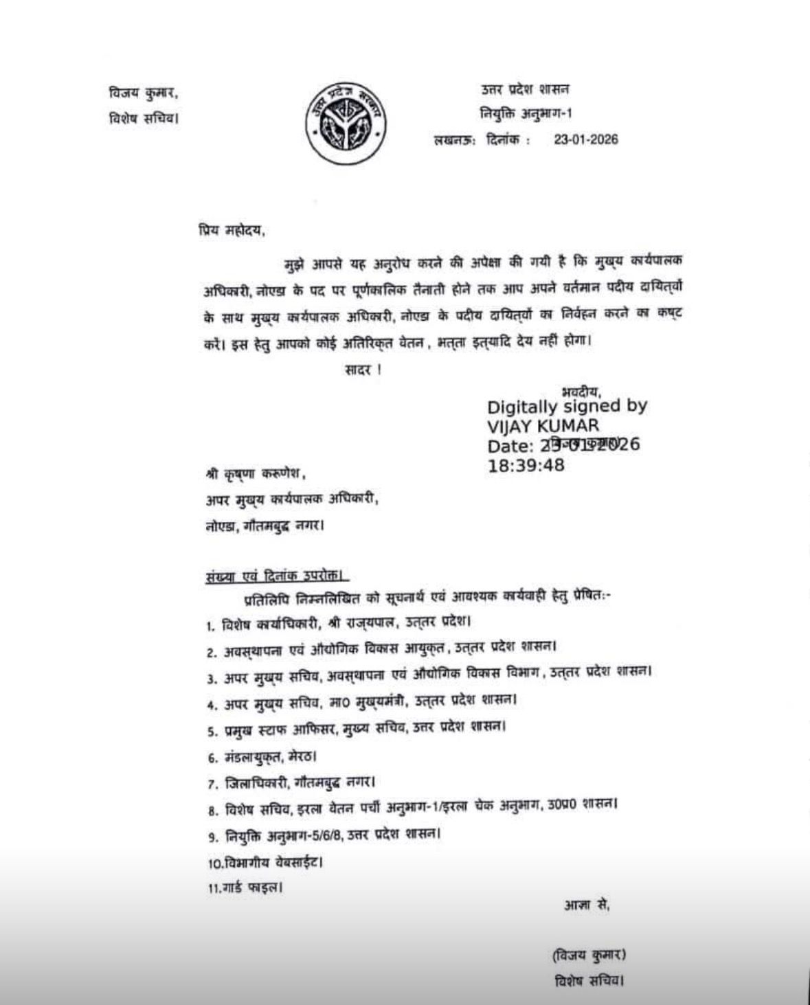 गौरतलब है कि जिस समय यह हादसा हुआ, उस दौरान कृष्णा करुणेश नोएडा प्राधिकरण में अपर मुख्य कार्यपालक अधिकारी (Additional CEO) के पद पर तैनात थे। प्रशासनिक अनुभव और कार्यशैली को देखते हुए अब उन्हें ही नोएडा अथॉरिटी की कमान सौंपी गई है।।
