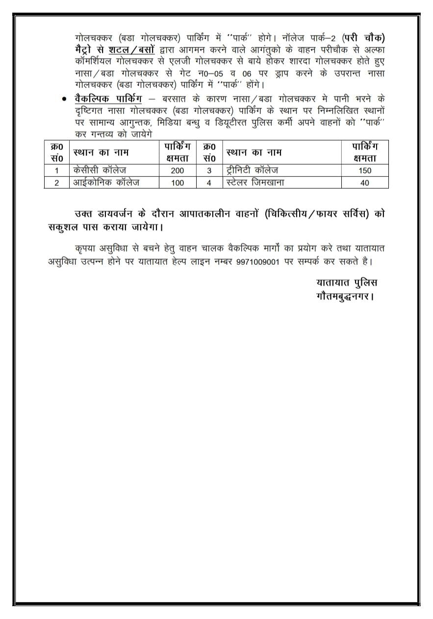 यातायात पुलिस ने वाहन चालकों से अपील की है कि वे असुविधा से बचने के लिए वैकल्पिक मार्गों का प्रयोग करें और किसी भी प्रकार की यातायात समस्या होने पर हेल्पलाइन नंबर 9971009001 पर संपर्क करें।