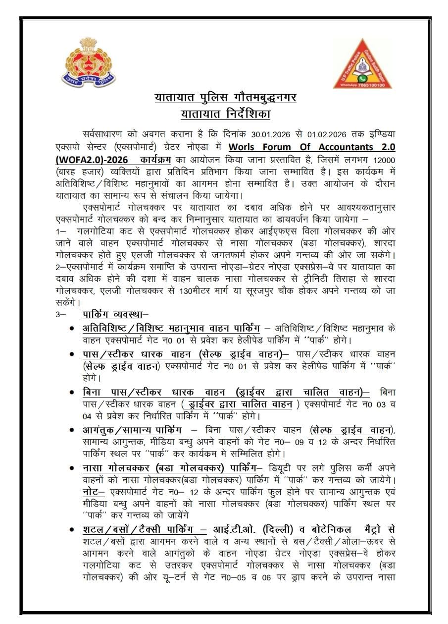 Greater Noida News (30 जनवरी, 2026): ग्रेटर नोएडा स्थित इंडिया एक्सपो सेंटर एंड मार्ट (एक्सपोमार्ट) में 30 जनवरी से 1 फरवरी 2026 तक आयोजित होने जा रहे World Forum of Accountants 2.0 (WOFA 2.0-2026) को लेकर पुलिस-प्रशासन ने आम जनता के लिए यातायात परामर्श (Traffic Advisory) जारी किया है। इस अंतरराष्ट्रीय स्तर के कार्यक्रम में प्रतिदिन लगभग 12 हजार प्रतिभागियों के पहुंचने की संभावना है, वहीं अतिविशिष्ट और विशिष्ट महानुभावों के आगमन को देखते हुए सुरक्षा व ट्रैफिक प्रबंधन के विशेष इंतजाम किए गए हैं।