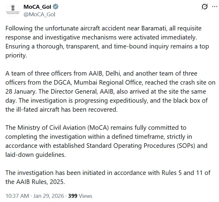 मंत्रालय ने बताया कि हादसे की जांच तेजी से आगे बढ़ रही है और दुर्घटनाग्रस्त विमान का ब्लैक बॉक्स भी सुरक्षित रूप से बरामद कर लिया गया है। ब्लैक बॉक्स से मिलने वाली तकनीकी जानकारी जांच में अहम भूमिका निभाएगी और इससे हादसे के वास्तविक कारणों को समझने में मदद मिलेगी।