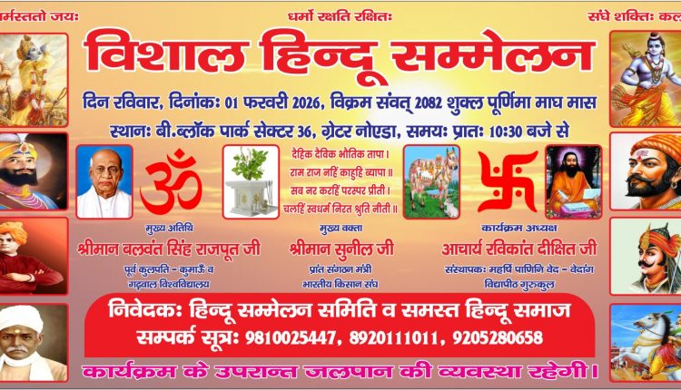 Greater Noida News (29/01/2026): आगामी 1 फरवरी, रविवार को सेक्टर-36 ग्रेटर नोएडा में एक विशाल हिंदू सम्मेलन का आयोजन होने जा रहा है। इस सम्मेलन में करीब 5 हजार लोगों के शामिल होने की उम्मीद है। कार्यक्रम में प्रदेश और राष्ट्रीय स्तर के वक्ता भी भाग लेंगे।