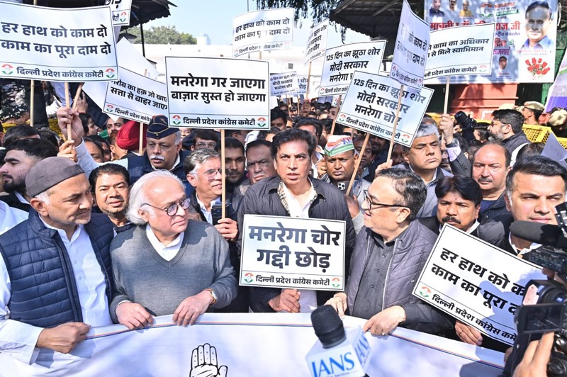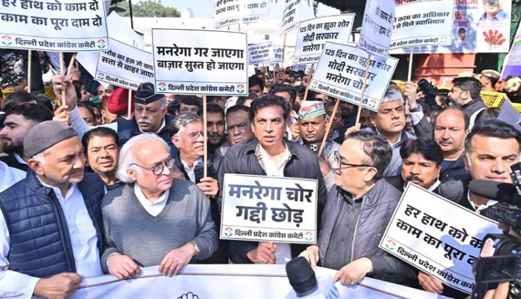 New Delhi News (30 January 2026): दिल्ली में अखिल भारतीय कांग्रेस कमेटी (AICC) के बाहर कांग्रेस नेताओं और कार्यकर्ताओं ने ‘मनरेगा बचाओ संग्राम’ के तहत जोरदार प्रदर्शन किया। इस प्रदर्शन का नेतृत्व दिल्ली कांग्रेस अध्यक्ष देवेंद्र यादव कर रहे थे। कांग्रेस नेताओं ने केंद्र सरकार पर मनरेगा को कमजोर करने का आरोप लगाते हुए इसके अधिकार और बजट की रक्षा की मांग की।
