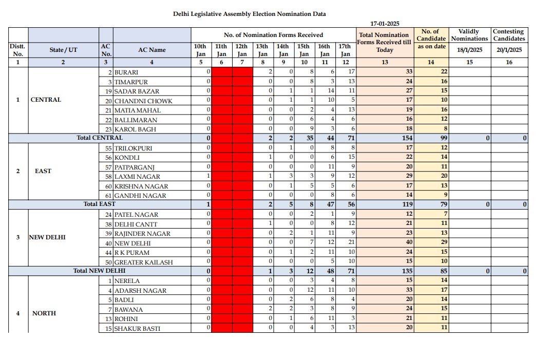 नई दिल्ली (18 जनवरी, 2025): दिल्ली विधानसभा चुनाव के लिए नामांकन प्रक्रिया के तहत आज सभी प्रत्याशियों के नामांकन पत्रों की जांच की जाएगी। मुख्य चुनाव अधिकारी (CEO) कार्यालय के अनुसार, दिल्ली की 70 सीटों के लिए कुल 981 उम्मीदवारों ने 1,521 नामांकन पत्र भरे हैं।