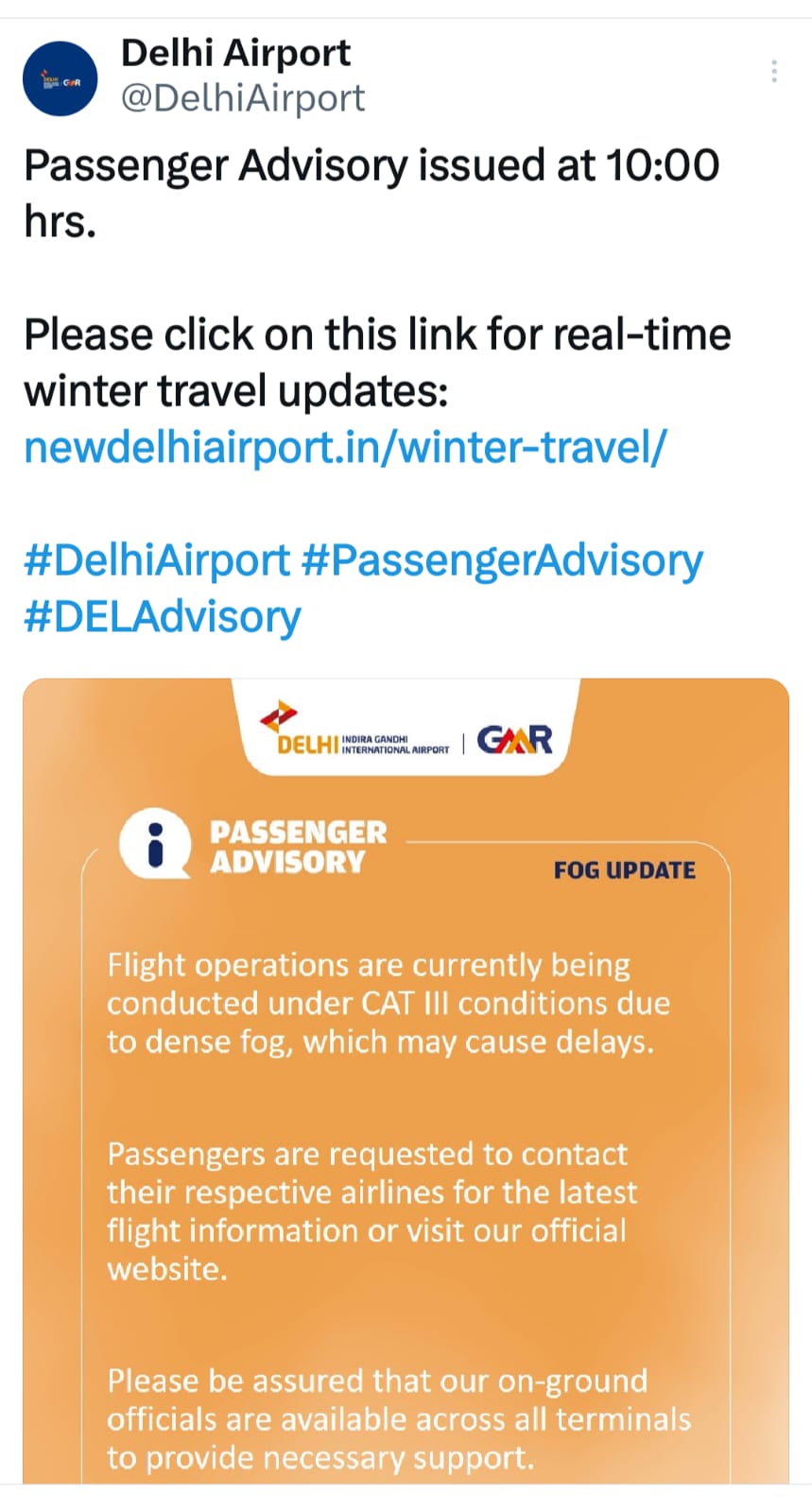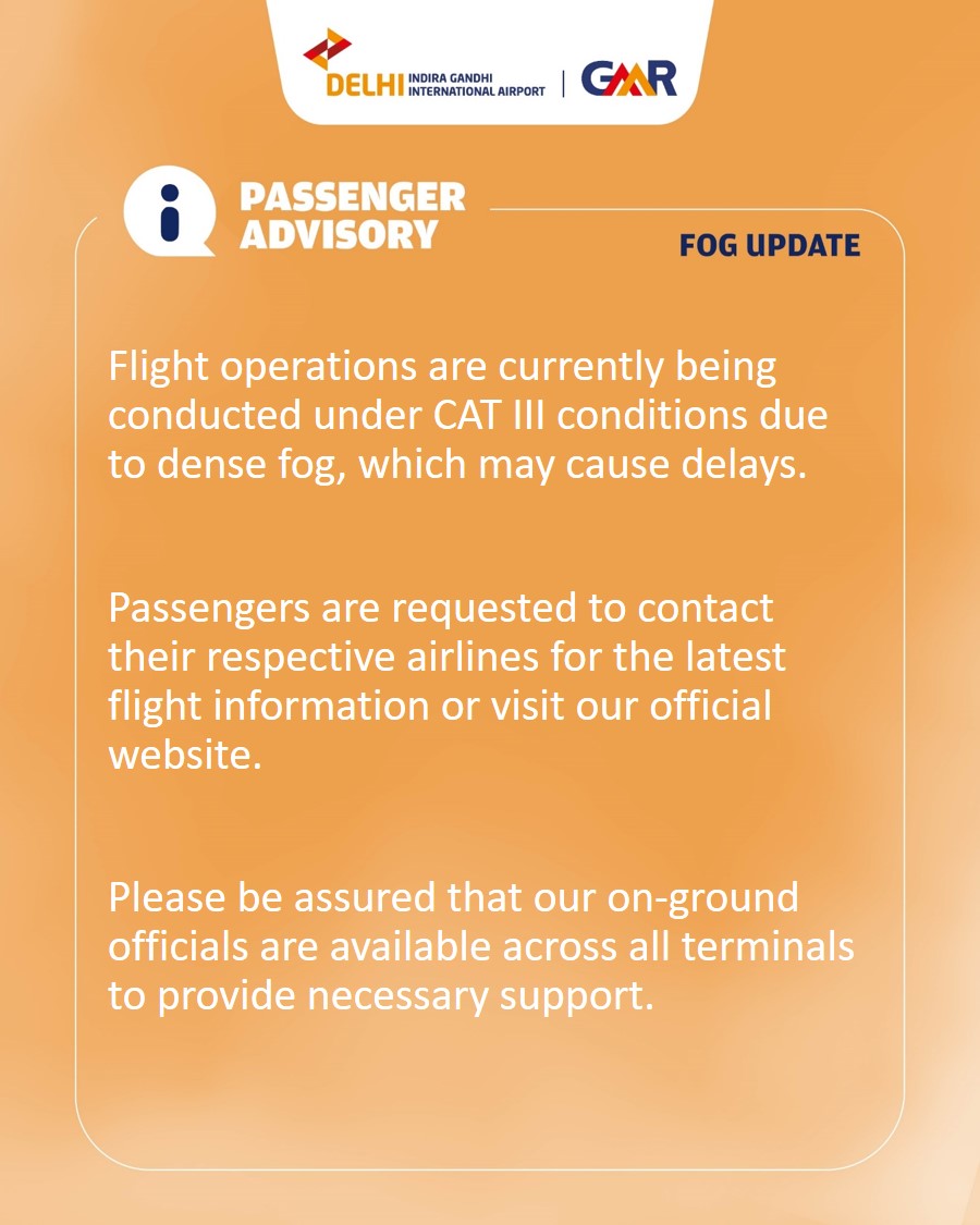 दिल्ली एयरपोर्ट ने सोशल मीडिया प्लेटफॉर्म एक्स पर यात्रियों से अपील की है कि वे अपनी फ्लाइट से जुड़ी ताजा जानकारी के लिए संबंधित एयरलाइंस से संपर्क करें या आधिकारिक वेबसाइट देखें। एयरपोर्ट प्रशासन ने यह भी भरोसा दिलाया है कि यात्रियों की सहायता के लिए सभी टर्मिनलों पर ग्राउंड स्टाफ तैनात है।।