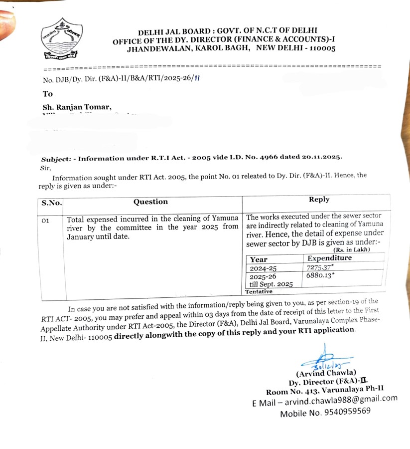 डॉ. रंजन तोमर द्वारा पूछे गए सवाल के जवाब में दिल्ली जल बोर्ड के डिप्टी डायरेक्टर अरविंद चावला ने बताया कि यह खर्च सीवर सेक्टर में किए गए उन कार्यों पर हुआ है, जो यमुना की सफाई से परोक्ष रूप से जुड़े हैं। उपलब्ध आंकड़ों के अनुसार, वर्ष 2024-25 में लगभग 72 करोड़ रुपये और वर्ष 2025-26 में करीब 68 करोड़ रुपये खर्च किए गए। इस तरह दो वर्षों में कुल खर्च लगभग 140 करोड़ रुपये तक पहुंच गया है।